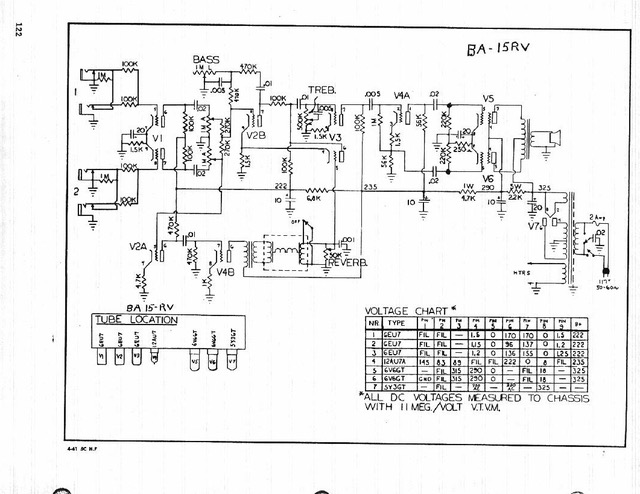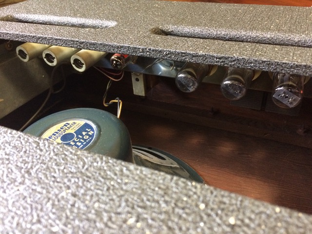 Tubes: 7 (8) (6EU7 (splitter), 6FQ7 (driver), 2x6L6 (output) or 2x6EU7, 6C4 and 1/2 6EU7 (tremolo), 1/2 6EU7 (splitter), 6FQ7 (driver), 2x6L6 (output), 0A2?