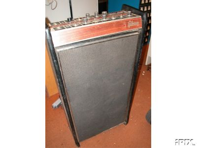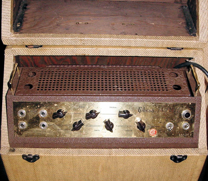 This is the coolest and rarest of the gibson Tweed era amps. It has one 12 inch Jensen and four 8 inch jensens, all original. In stereo the tremelo goes left to right like a leslie. This one actually still has the Stack knobs intact. (Fralin Pickups on Gbase Gear Mall)