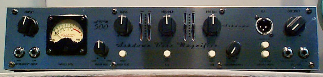 Opinion: I bought this amp hoping to achieve a big low end without the mud [using this amp with an ABM 410H]. Boy did I get it! Construction is very solid. It has a very hip backlit VU meter to monitor input signal. Inputs are proveided for Active/Passive basses. The "Input Mix" feature goes from solid state clean to triode tube grind. The Sub-Harmoniser feature adds even more low end by adding a note one octave below the note played. It tracks very well. The power section really handles these low frequencies well. Where other amps would be struggling this amp shows no signs of clipping providing lots of headroom. The "Sub Output" provides a filtered low pass conection to powered cabs providing even more low end. I play my Warwick Fretless Thumb 5 through the system and it sounds incredible. The lower registers are fully defined without the slightest hint of mud. This thing is the "REAL DEAL"! Source: Jim Marsolino (jlino56@aol.com), www.bgra.net/reviews/ashdown-abm500-rvw.html, July 2002