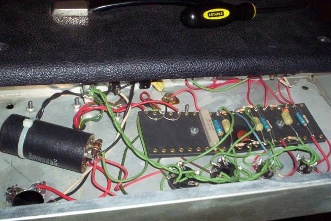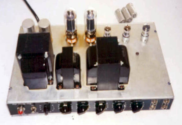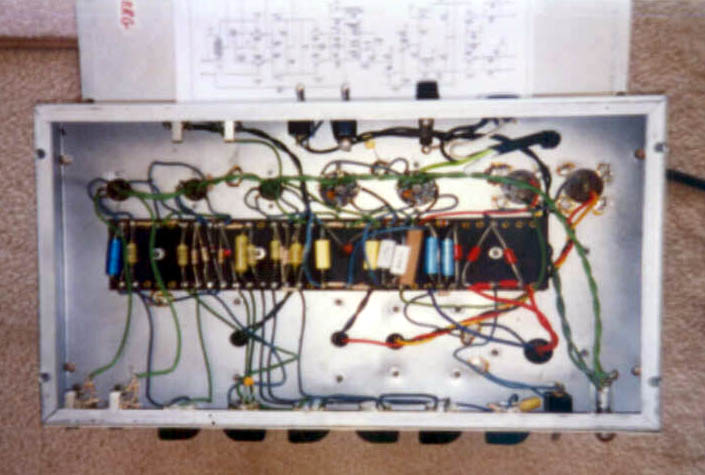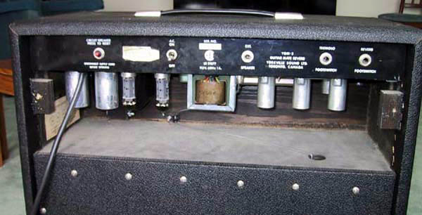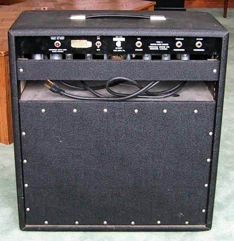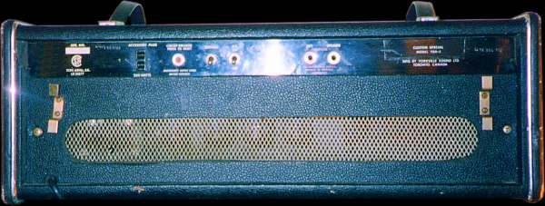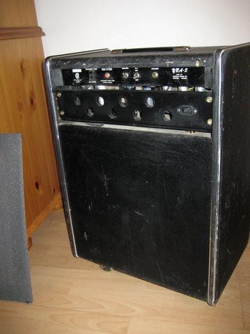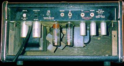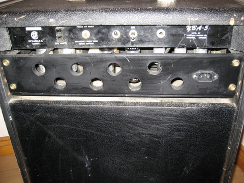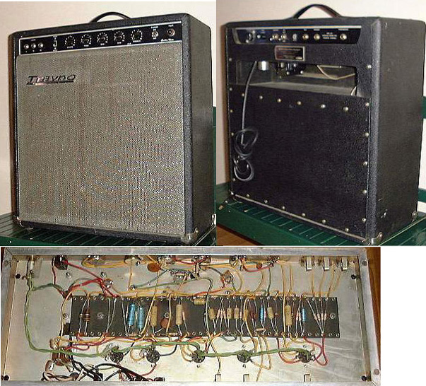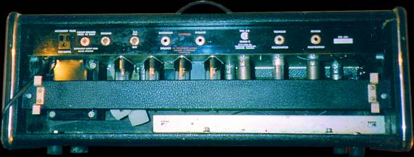[US?] $150 [used], very early model, the serial number is 0278, which places it in 1966, uses 6CA7 tubes as specified in the tube chart, no tube rectifier, and the marshall style phenolic turret board, also, it has the hole in the chassis for the tube rectifier socket, but it is blocked with a circular steel plate, the 5 volt rectifier heater winding at the power tranny is cut about 2 inches out, December 1998