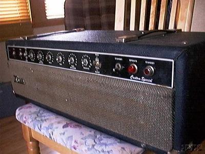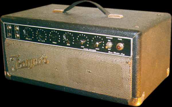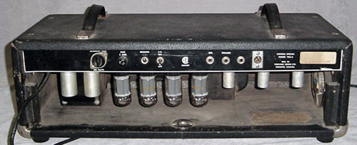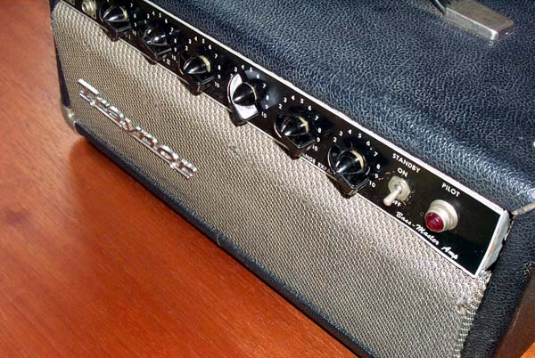 Early models were tube rectified (5AR4) and used two 7027A power tubes. They feature a 'flip-top' design that allowes the top of the head to open like a lid. Bass-Masters are identical in appearance to the Voice Master/Signature;
