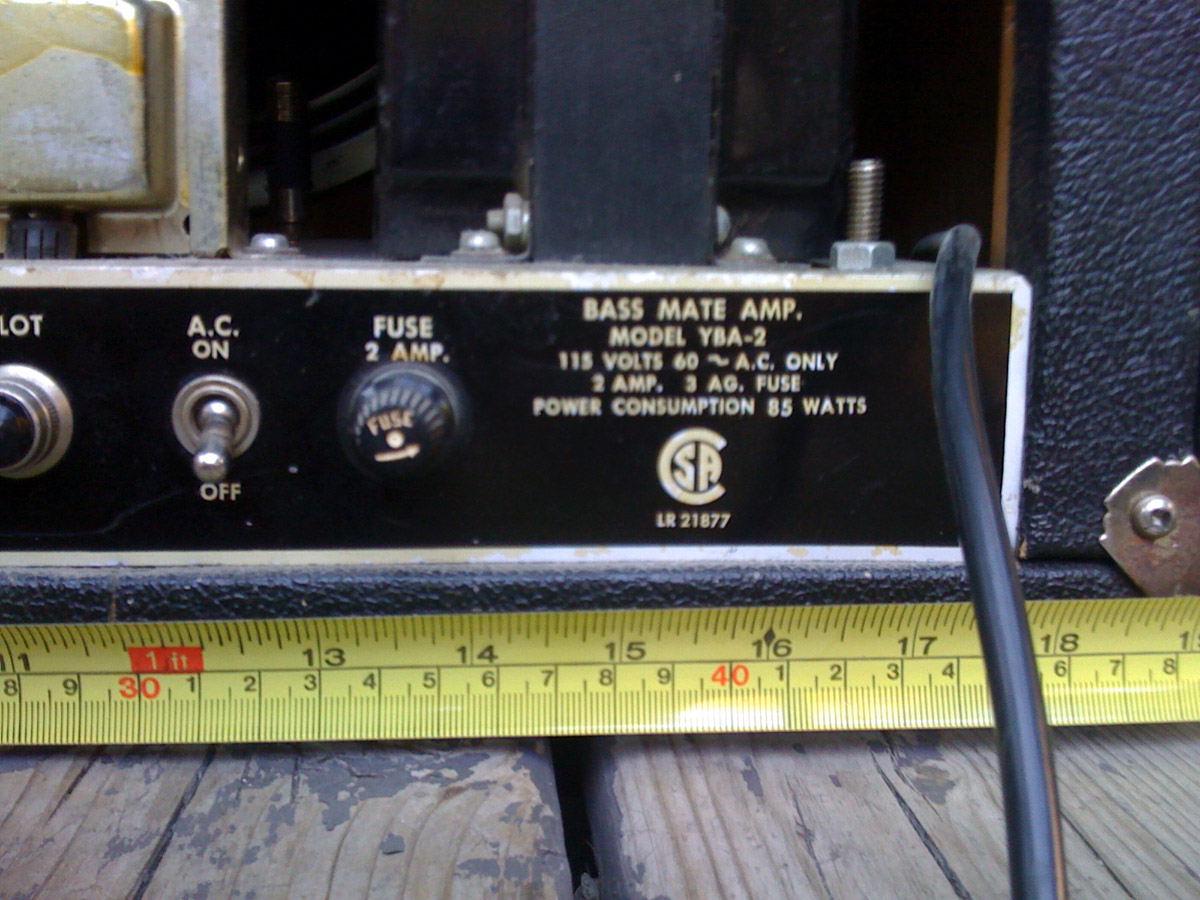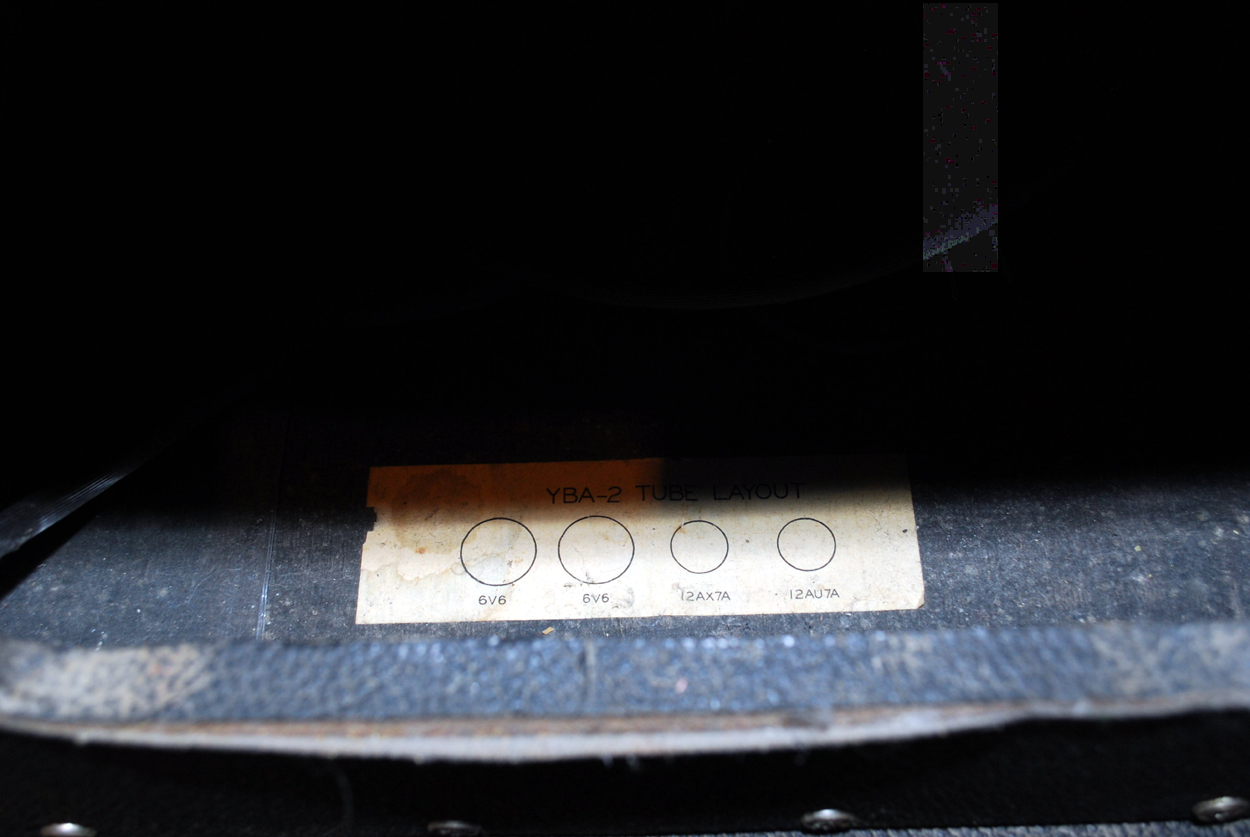 1966. A 1967 YBA-1 is reported to feature a diode rectifier. The used tubes are, as indicated in the amp: Two 6CA7s (replaceable by EL34s) and three 12AX7As (also called 7025s or ECC83s); plate voltages have always been a question on these units, but I think this may be largely because of confusion with the YBA-1A models that run VERY high plate voltages; most of the YBA-1 models probably come in somewhere +/-450 volts (one has reported 425 volts on plate, another one ca. 437 volts); this may have gotten higher after 1971, but into the summer of 1971 I'd expect the plate voltages on 6CA7s to be down substantially from the YBA-1A; have the chassis sliding-in ala Fender.