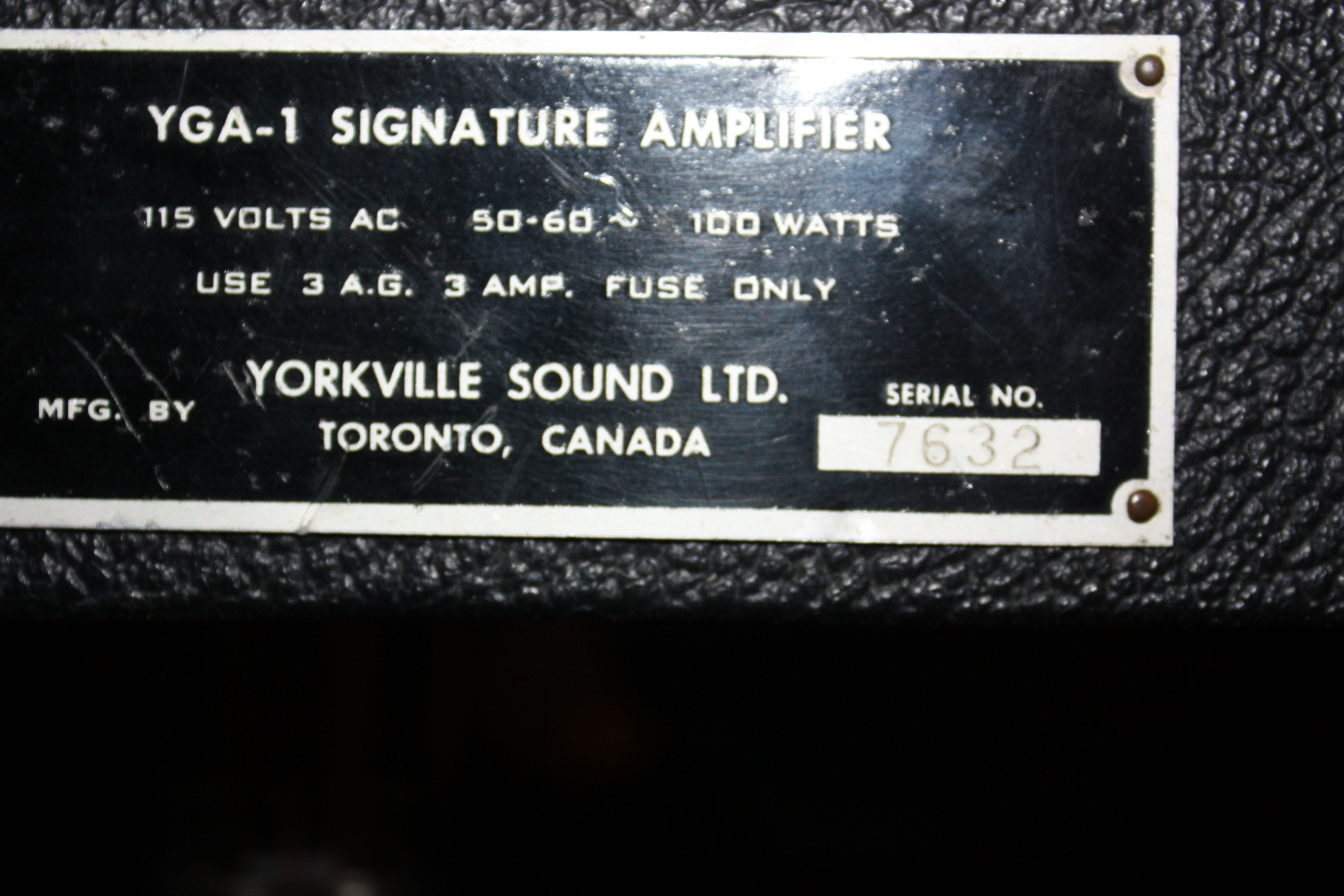 The YT-15 has two 15" paper-cone woofers @ 8-ohm each, (mine dated "July 19, 1973") and logoed Yorkville Sound on gold labels. The cabinet is 16-ohm, but there is no reference to power-handling capacity. The logo plate looks like all the others except that the letters are solid & chromed instead of diamond chrome like my YSR-1 amp head. Cabinet is black